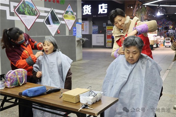 现场各志愿服务区域人气火爆,热火朝天。而在这些忙碌的身影中,记者注意到有不少老年志愿者正热情满满地为居民服务,为活动增添了许多温暖。“我已经坚持为群众义务理发5年了。”今年56岁的潘江英笑着说,自己从事理发行业多年,退休后一直想利用自身所长服务群众,于是便主动联系社区加入了志愿者团队,风雨无阻参与到社区每月定期举办的“便民大集市”活动中,多年来已服务群众上千人次。